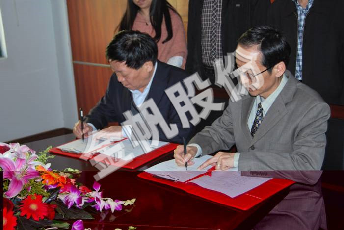 图中为兰廷泽处长(左)和罗强董事长(右)签署“金帆奖学金”协议